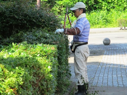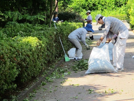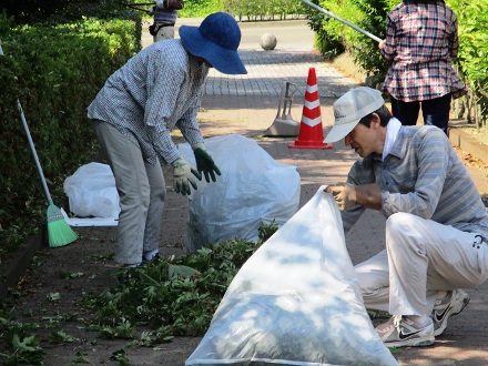 第9回の定期活動を参加者14名(男性8名、女性6名)、作業内容は、泉区公園課の除草作業により予定場所を変更し、東街区側の歩道の草取りや刈込を実施した。